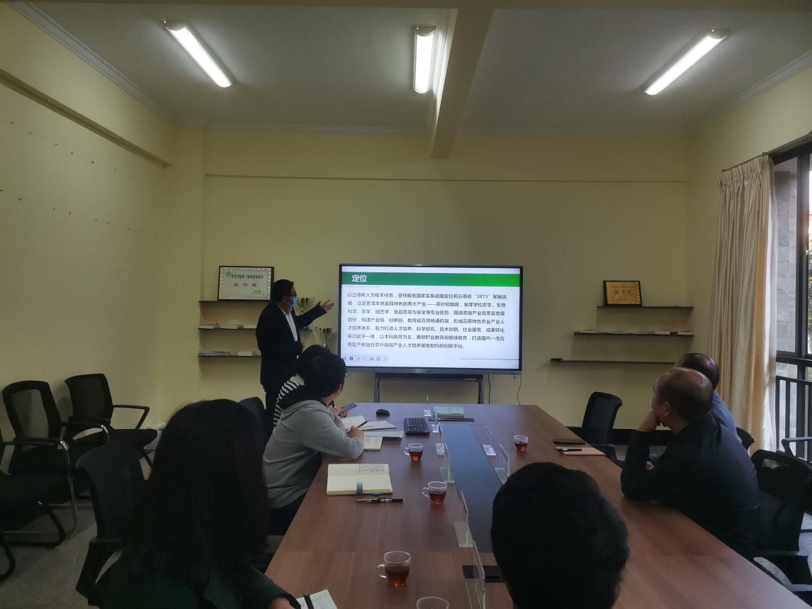 调研会由副院长刘杰主持,崔现亮处长首先介绍了此次调研的目的和意义,单治国副院长就普洱学院茶叶咖啡现代产业学院的建设进展的情况做了全面汇报,整个汇报内容分为学院建设背景与目标、基础设施建设进展、专业和学科建设基础及师资队伍建设情况、课程设置与教学改革举措、科研创新与社会服务能力提升、招生就业与校友资源开发工作、存在问题、挑战及应对策略等七个方面。
