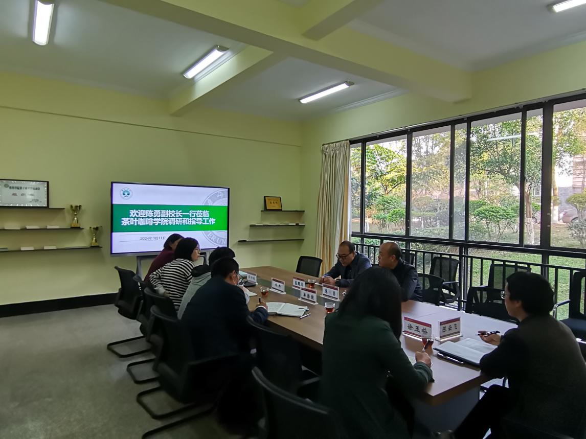 为了做好茶叶咖啡现代产业学院的申报工作,学校陈勇副校长偕教务处崔现亮处长一行于2024年3月11日上午前来茶叶咖啡学院现场调研茶叶咖啡现代产业学院建设推进工作情况,茶叶咖啡学院副院长单治国、刘杰及学院办公室主任任四妹、教务科科长陈云飞、茶学专业负责人张春花、农学教研室主任徐玉梅等参加调研座谈会。