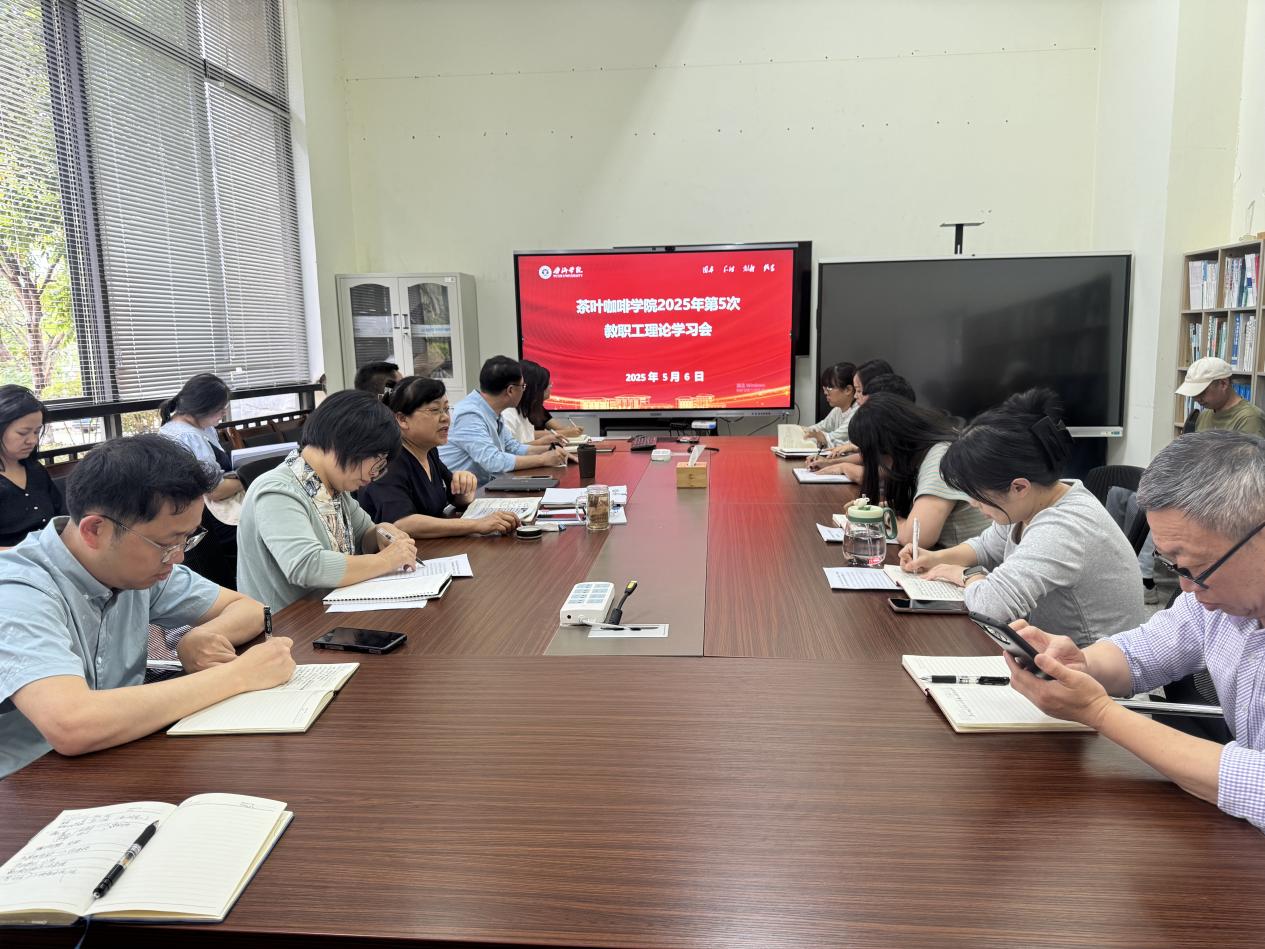 2025年5月6日,茶叶咖啡学院召开2025年第5次教职工理论学习会,会议由党总支书记李秀主持,学院全体教职员工参加会议,会上专题学习了习近平总书记在《求是》2025年第9期发表的重要文章《激励新时代青年在中国式现代化建设中挺膺担当》。